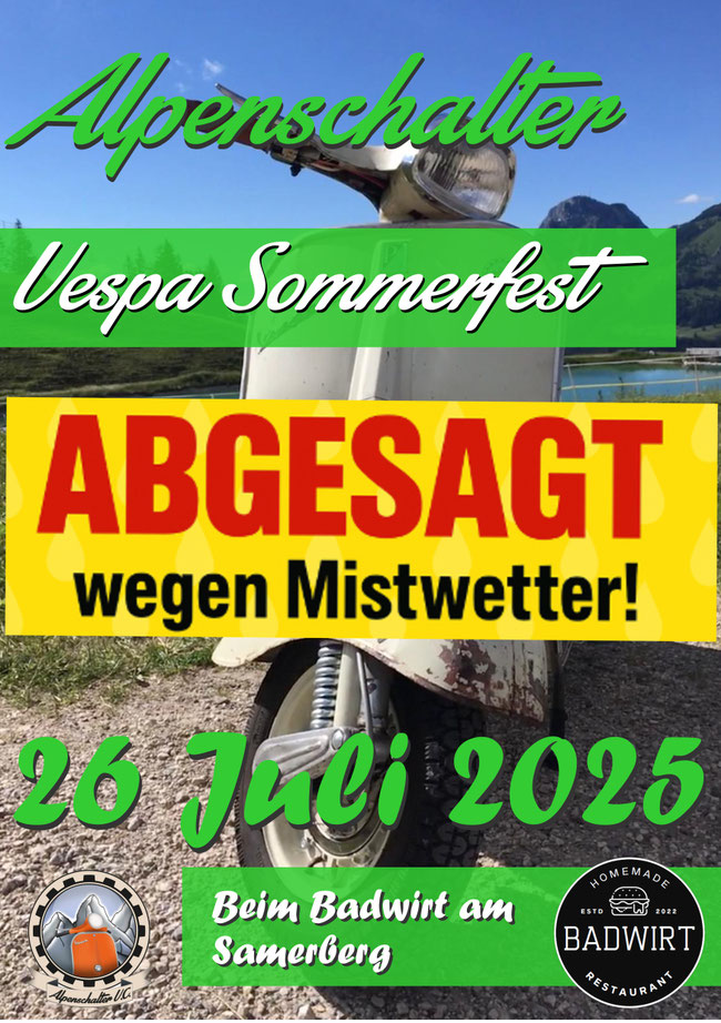 Liebe Vespafreunde! Wir müssen das geplante Sommerfest leider wegen des zu erwartenden Dauerregens absagen. Wir bedauern das zutiefst und bitte um Versändniss für die Absage. Wir hätten uns es wirklich auch anders gewünscht.